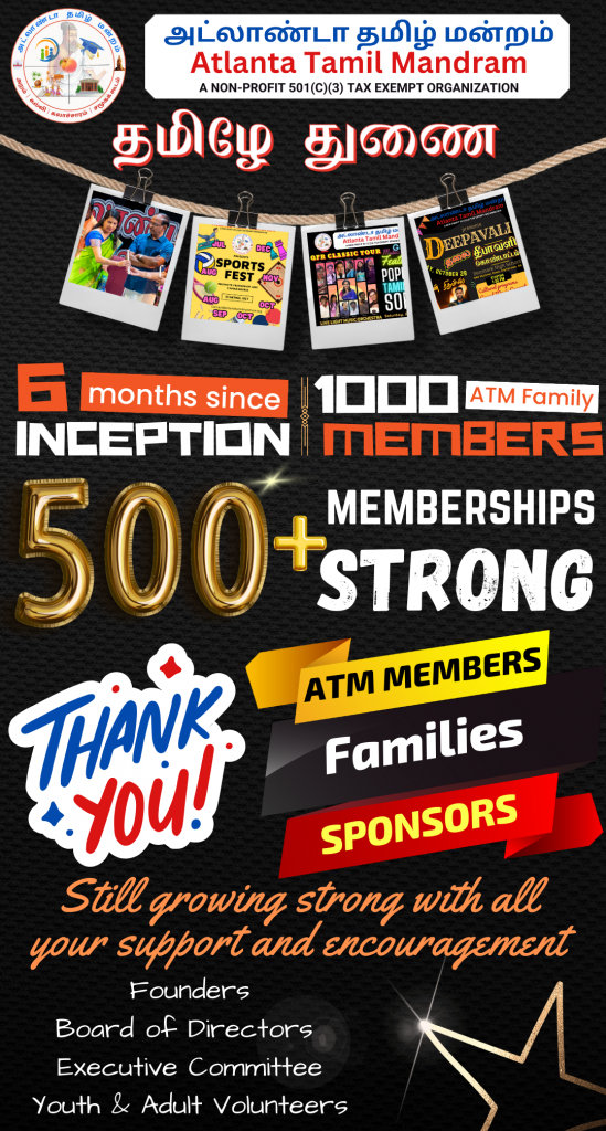 அட்லாண்டா தமிழ் மன்றம் 500-க்கும் அதிகமான உறுப்பினர்களை கடந்து வளர்ந்து வருகிறது என்பதை பெருமையுடன் அறிவித்து மகிழ்கிறோம். இந்த ஆண்டின் துவக்கத்தில், பெப்ரவரி-இல் அதிகாரபூர்வமாக அமைக்கப்பெற்று, ஏப்ரல்-இல் சித்திரை திருவிழாவுடன் துவக்கிவைக்க பட்ட மன்றத்திற்கு, தாங்கள் அளித்த பேராதரவுக்கு நன்றிகள் பல.